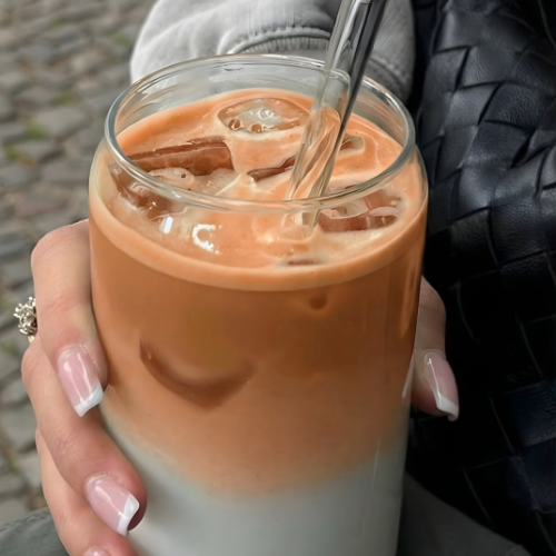 Verse ensuite 130 ml de lait froid (végétal ou non), ajoute un glaçon et profite d’un latte pêche délicieux et rafraîchissant.👉 Une nouvelle façon de savourer une pause sucrée, saine et sans culpabilité.